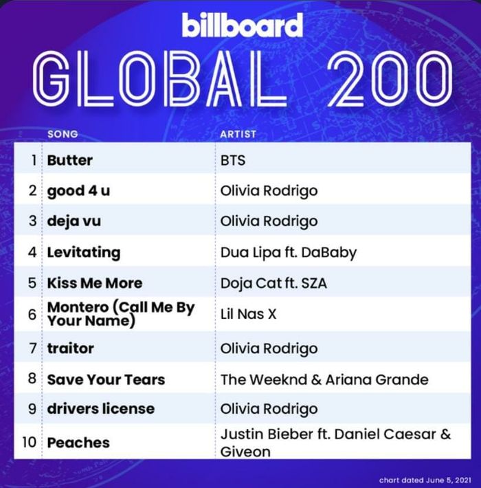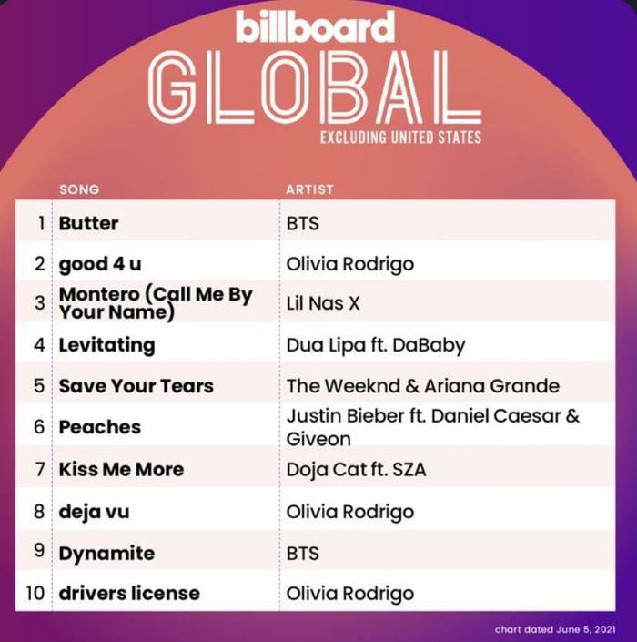 Tak hanya Billboard Hot 100, “Butter” juga menguasai 2 tangga lagu lain di Billboard. Yaitu, memuncaki chart Billboard Global Excluding United States dan Billboard Global 200!