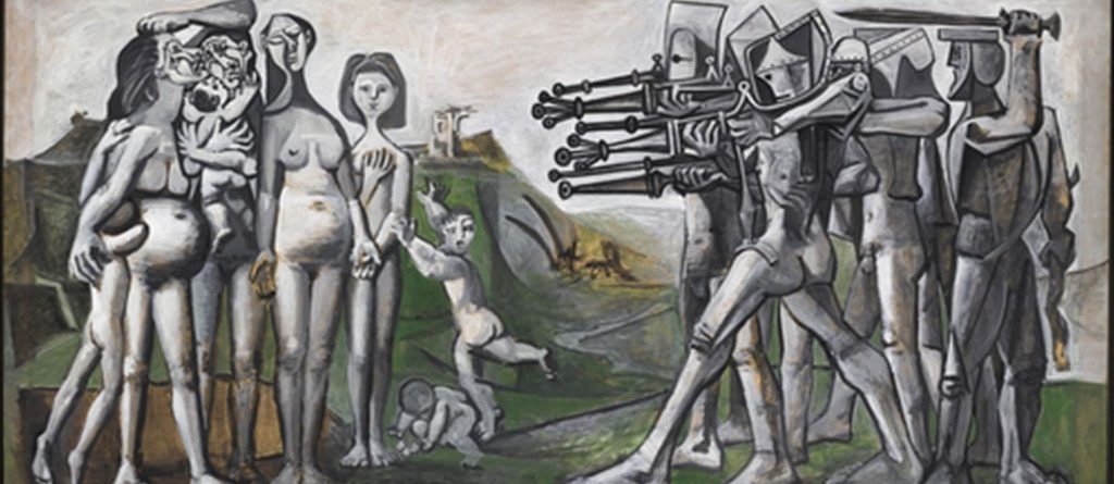 Lukisan itu menggambarkan sekelompok wanita telanjang dan anak-anak yang diancam dengan todongan senjata oleh regu tembak. Tampak sekali bagaimana melalui karya seni, Picasso menyiratkan pesan menentang peperang dan kekerasan.
