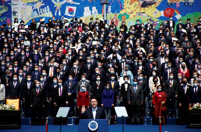 Presiden Korea Selatan (Korsel) yang baru, Yoon Suk Yeol, dilantik pada Selasa, 10 Mei 2022. Tampak hadir Presiden RI Kelima Megawati Soekarnoputri.