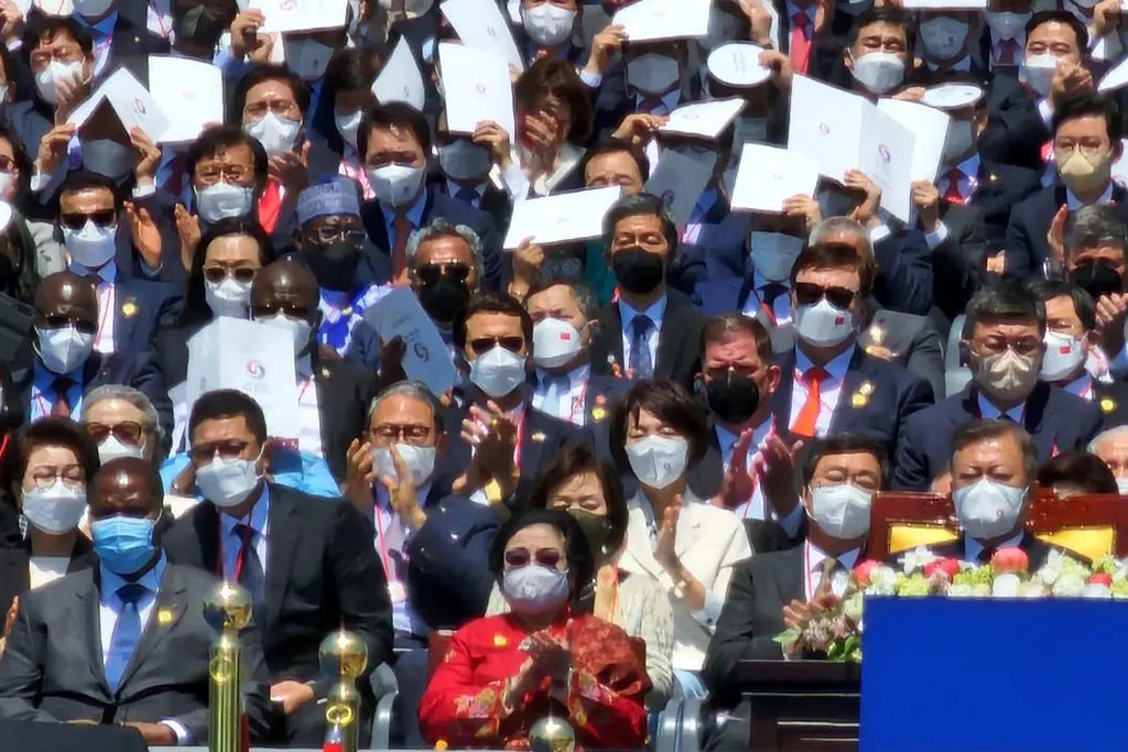 Ia duduk di deretan kursi bagian depan. Bersamanya adalah Wakil Presiden Tiongkok Wang Qishan, Presiden Singapura Halimah Yacob, Presiden Afrika Tengah Faustin-Archange Touadéra, Mantan PM Jepang Yukio Hatoyama, serta Douglas Emhoff, suami Kamala Harris yang merupakan Wakil Presiden Amerika Serikat (AS).