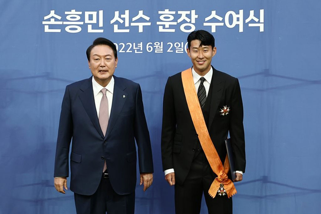 Presiden Korea Selatan Yoon Suk-yeol memberikan Medali Cheongnyong kepada Son Heung-min, penyerang Tottenham Hotspur.