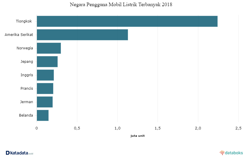 Daftar 8 negara pengguna mobil listrik terbanyak di dunia bisa dilihat di grafik berikut ini.